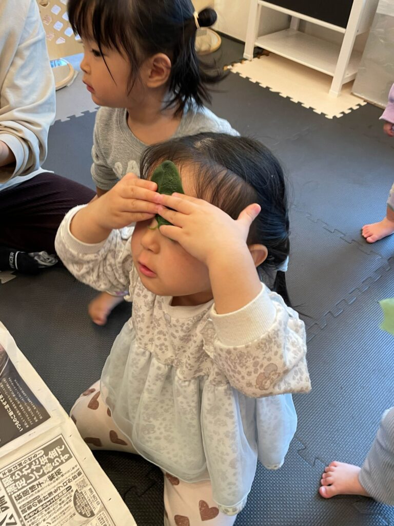 触ったり、ちぎったり、匂いを嗅いだり、中には頭に乗せてみる子もいましたよ。生の食材に触れる良い機会となりました😆