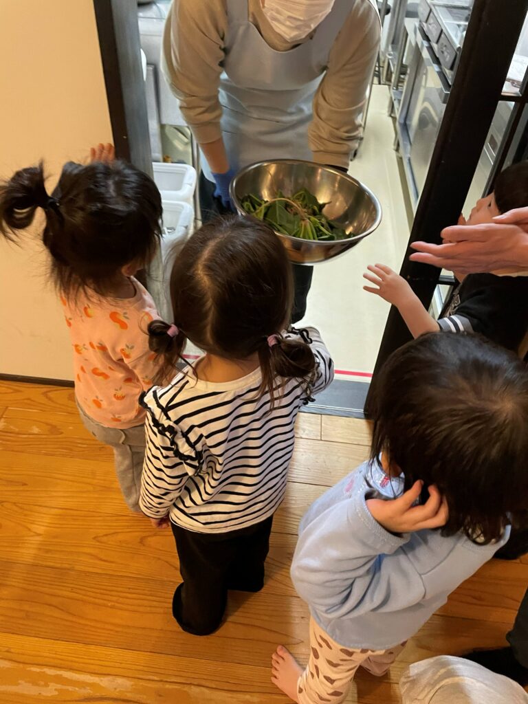 先日食育活動でほうれん草に触ってみたつき組、にじ組の子どもたち。