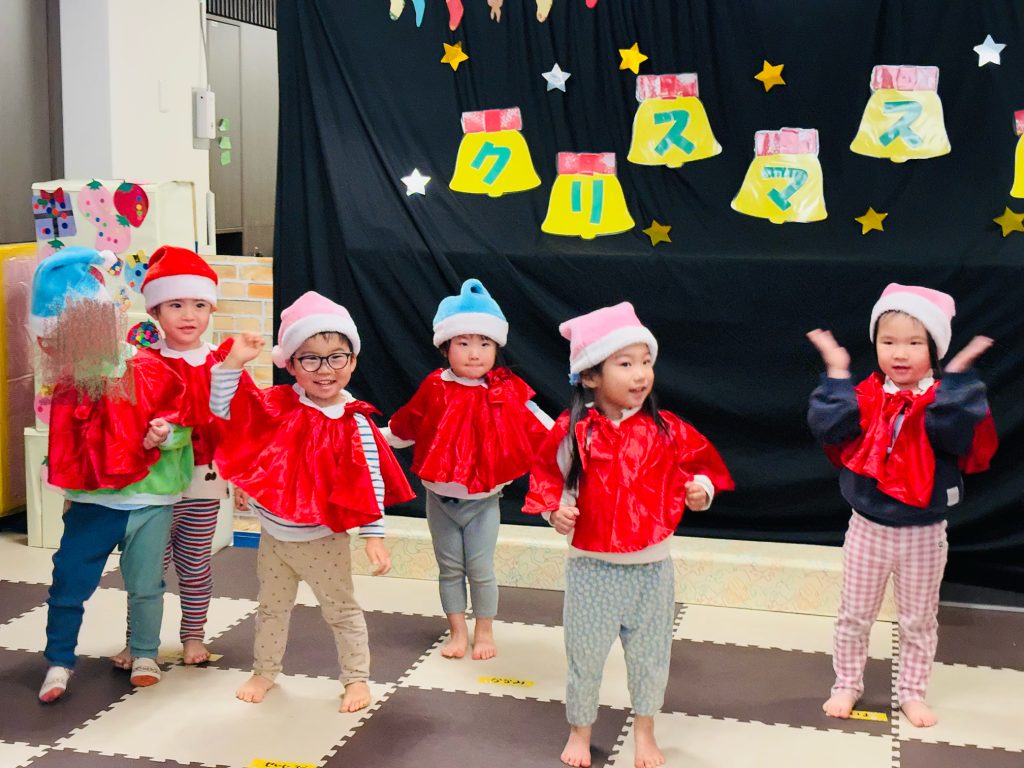 2歳児クラスでは、はなかっぱの「えがおのまほう」をサンタ帽とケープをつけて、小人になりきってダンスダンス!練習以上に楽しんで踊ることができましたよ☆