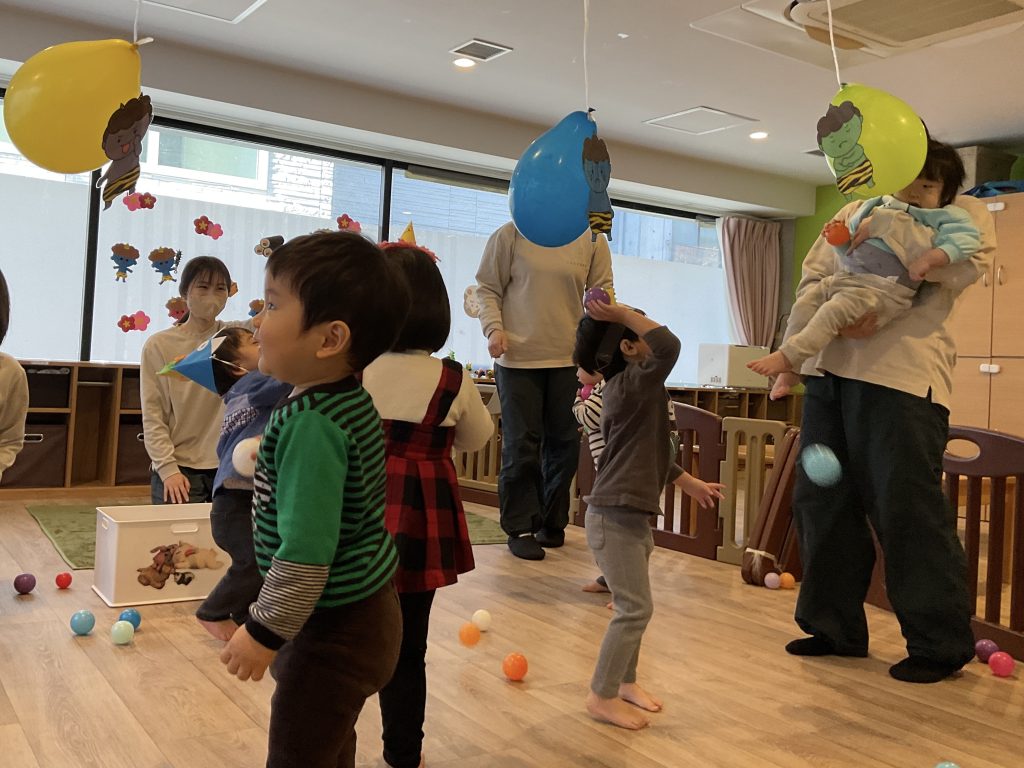 その次は風船の鬼さんに向かってカラーボールを豆に見立てて「鬼はそと、福はうち」と豆まき🥜