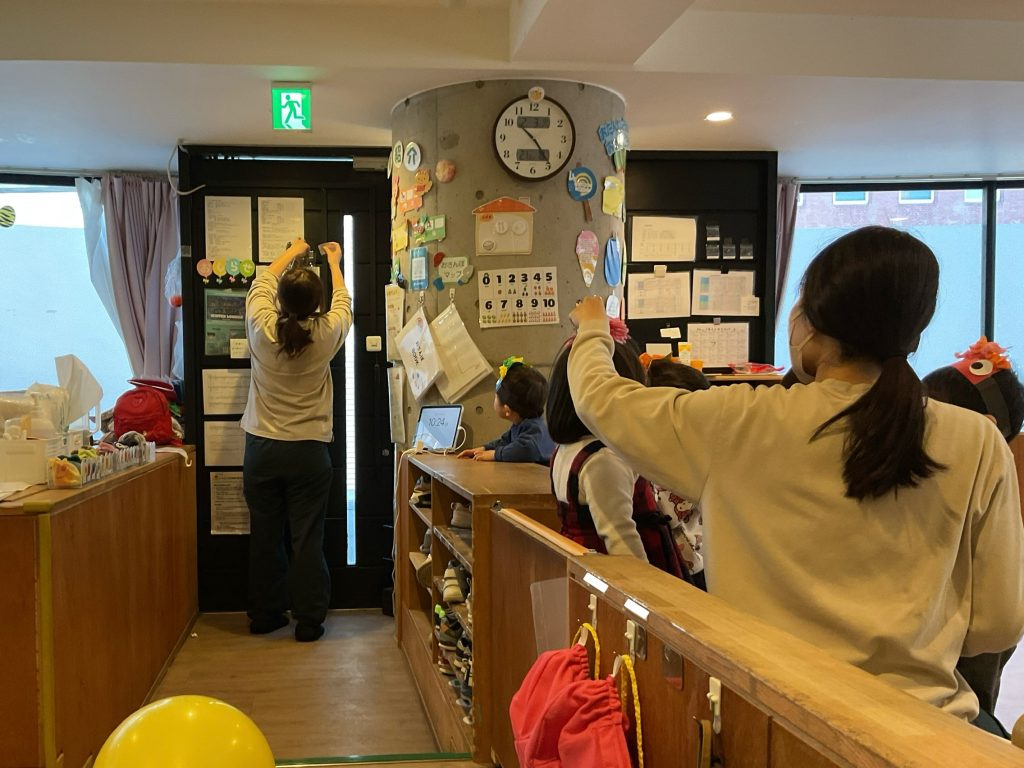 鬼さんが帰った後は、もう入ってこれないようにと柊と大豆の飾りを飾る様子を見守りました!