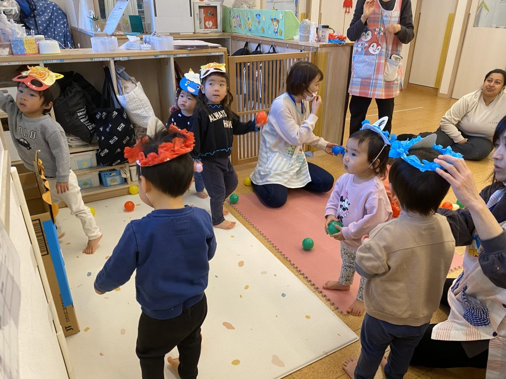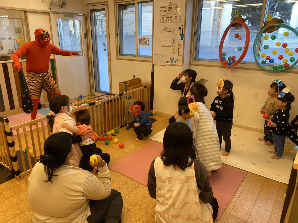 2月3日に豆まき集会を行いました!いつもと異なる雰囲気に、皆わくわくドキドキ・・・ いつでも鬼が登場しても大丈夫なように、おまめに代わるボールを投げるコントロールはバッチリ‼ そして優しい赤鬼が登場! 鬼を無事に退治すると、福の神も登場! 根岸園のお友だちが健康に、そして楽しく過ごせますように‼